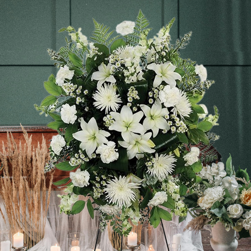 A tall, elegant design of white blooms symbolizing peace and remembrance.